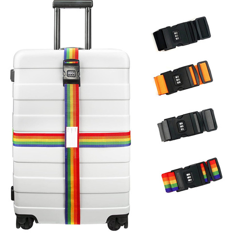 حزام أمتعة قابل للتعديل بطول 2 متر من البوليستر للسفر، حزام حقائب قوس قزح مع قفل آمن مشفر، حزام حقائب آمن مع مشبك